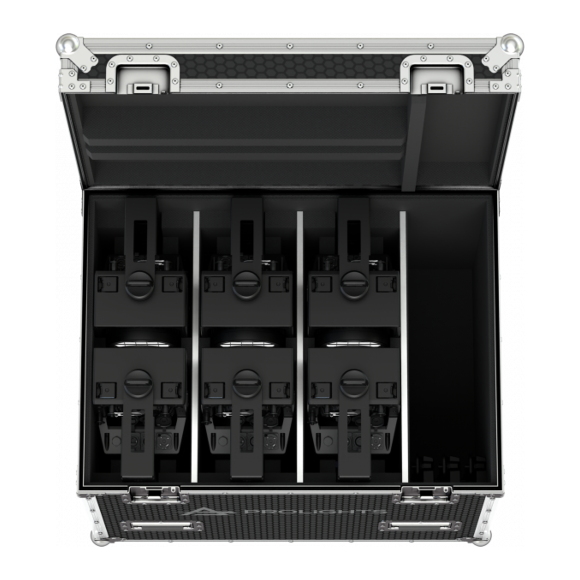 Omschrijving: Flightcase met interne compartimenten, ontworpen voor 6 stuks SUNRISE2FLX/SUNBLASTFLX (met en zonder beugel)