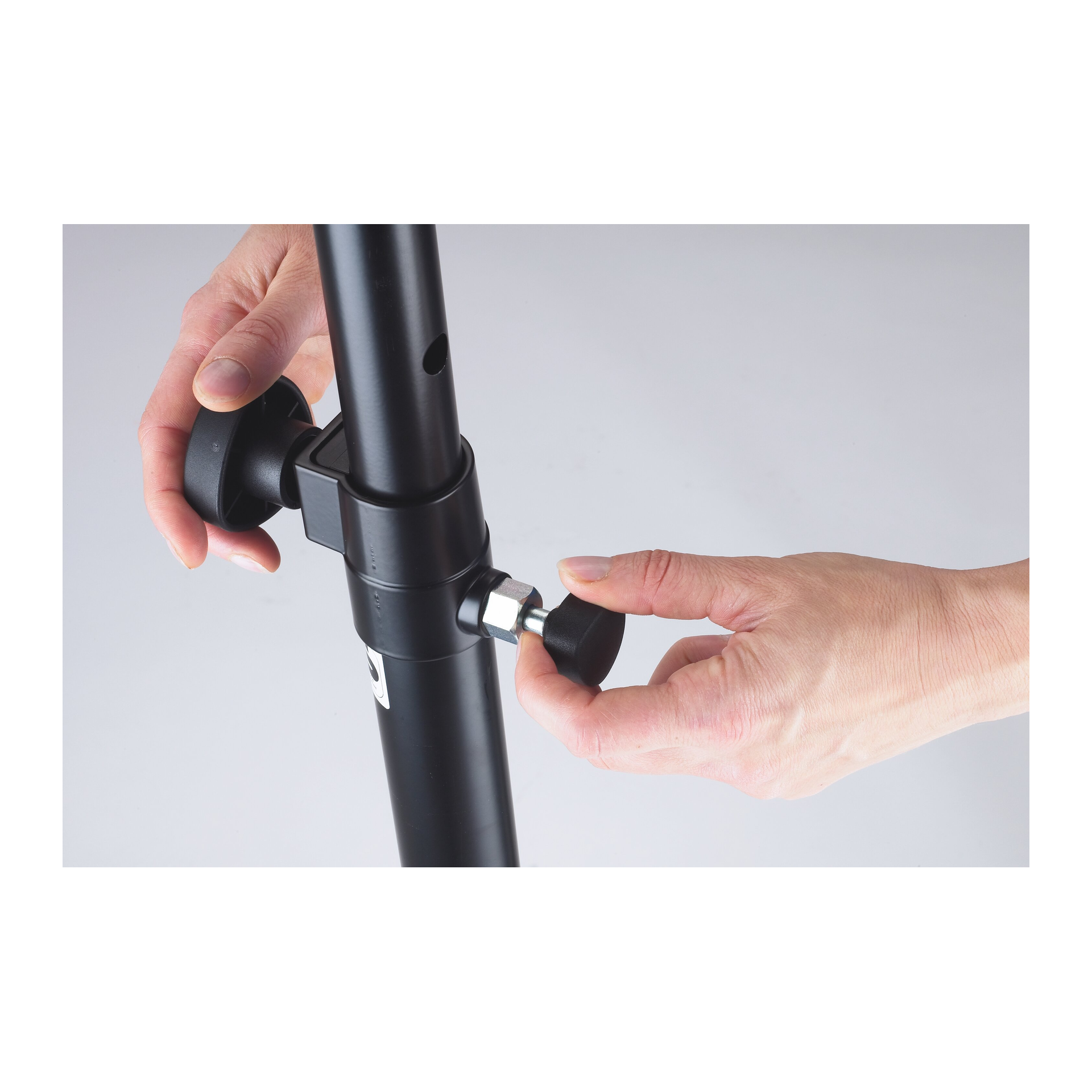 Een decoratieve, ruimtebesparende luidsprekerstatief. De zwarte gietijzeren voetplaat met een relatief kleine diameter neemt weinig ruimte in beslag. De beproefde veerbelaste borgpen met vergrendelschroef maakt hoogteverstelling eenvoudig en veilig.