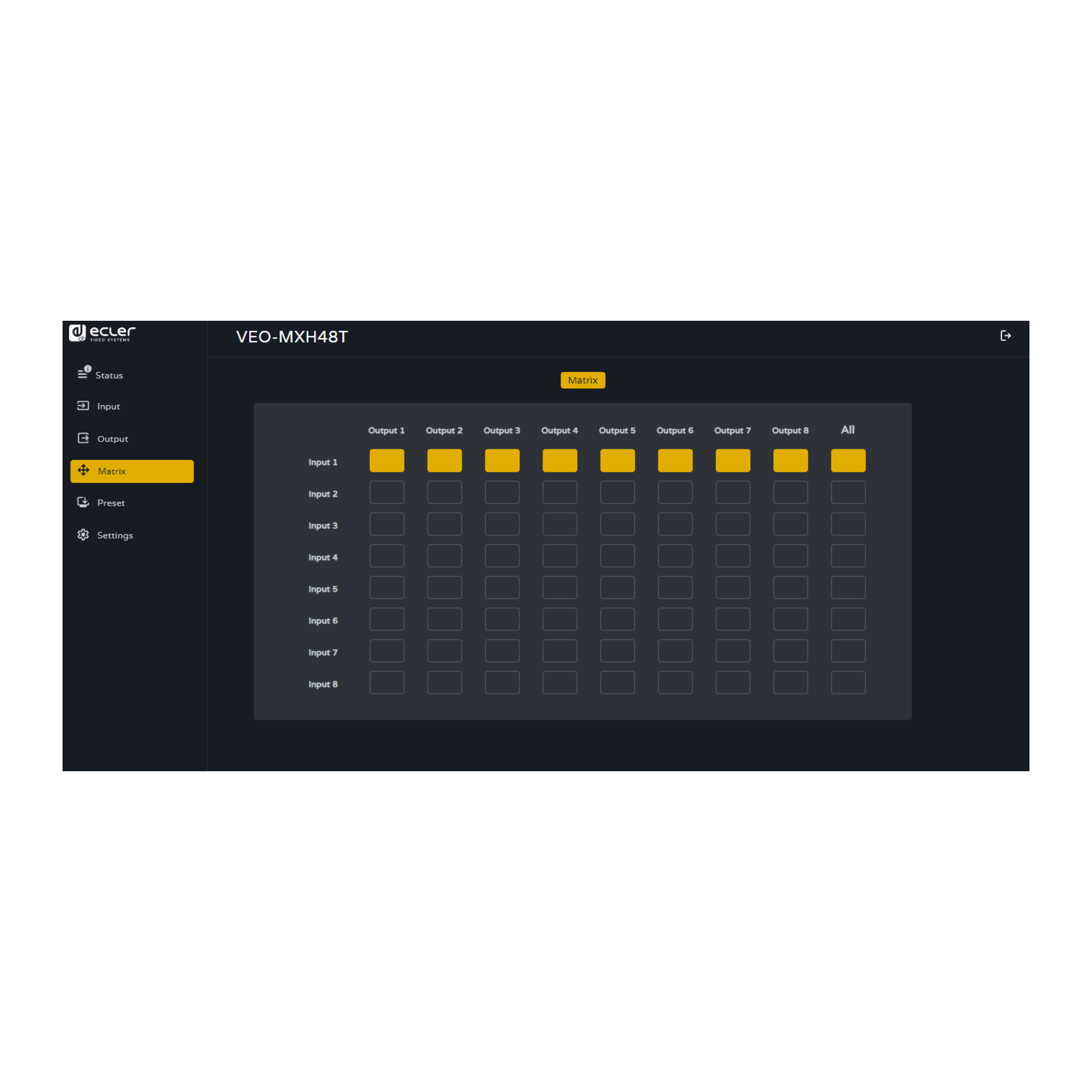 De VEO-MXH48T is een 8x8 HDBaseT- en HDMI-matrix die 4K-resolutie ondersteunt met 60 Hz en 4:4:4 chroma-sampling. De 8 HDBaseT-uitgangen ondersteunen 4K-video tot 40 meter en Full HD tot 70 meter, met PoC-voeding voor compatibele ontvangers.